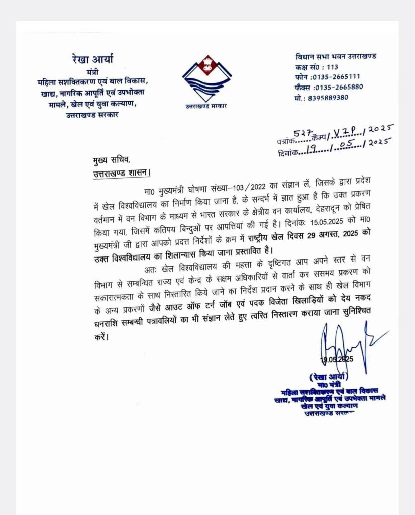 पत्र में कहा गया है कि राष्ट्रीय खेल दिवस 29 अगस्त से पहले सभी औपचारिकताएं पूरी करने को सर्वोच्च प्राथमिकता पर रखा जाए। खेल मंत्री रेखा आर्या ने पत्र में इसके अलावा 38 वें राष्ट्रीय खेलों में पदक जीतने वाले खिलाड़ियों को आउट ऑफ टर्न सरकारी नौकरी देने और पदक विजेताओं को नगद इनाम धन राशि दिए जाने के मामलों में भी त्वरित कार्यवाही के निर्देश दिए हैं।